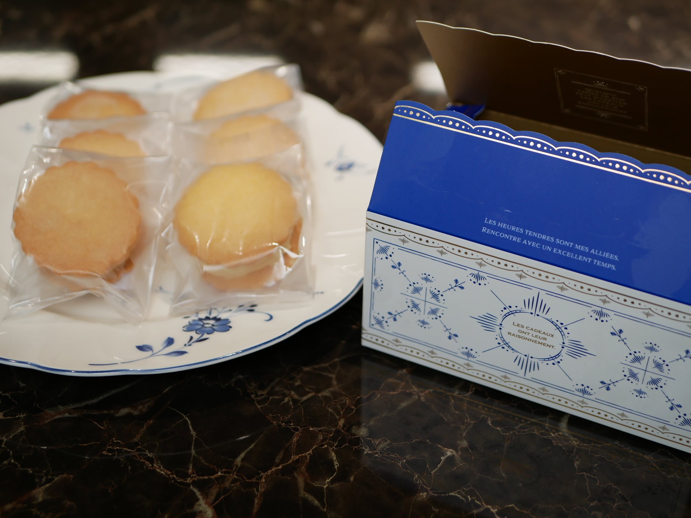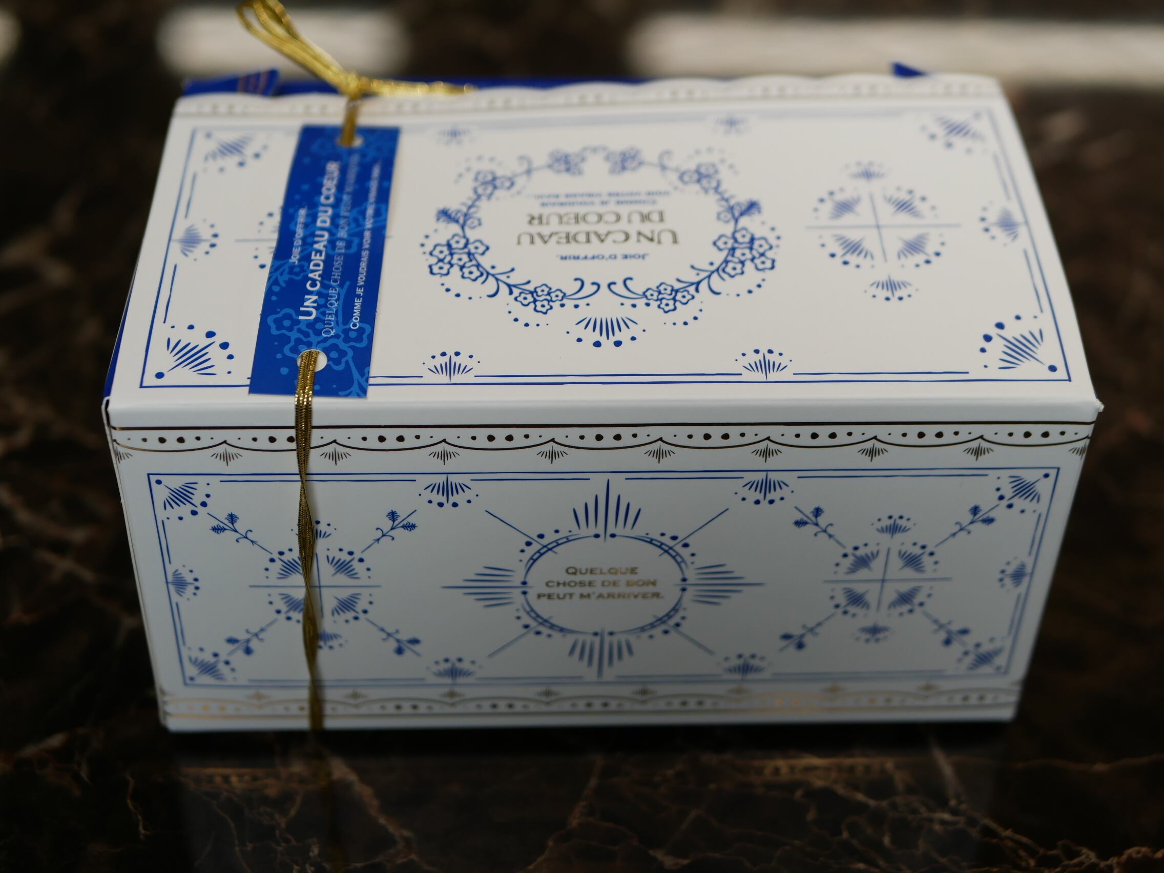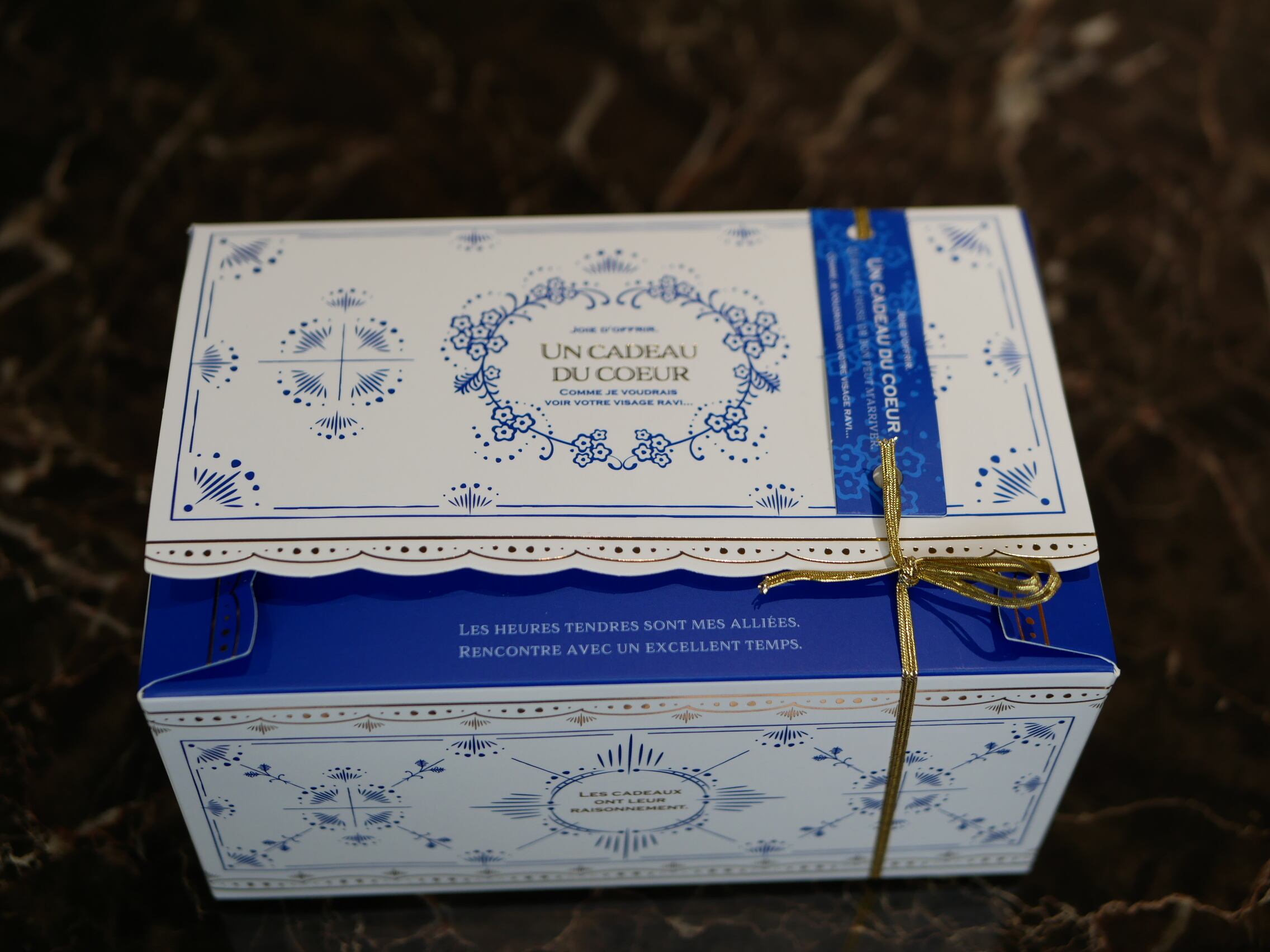 ブルーとゴールドが素敵な紙製の箱です。