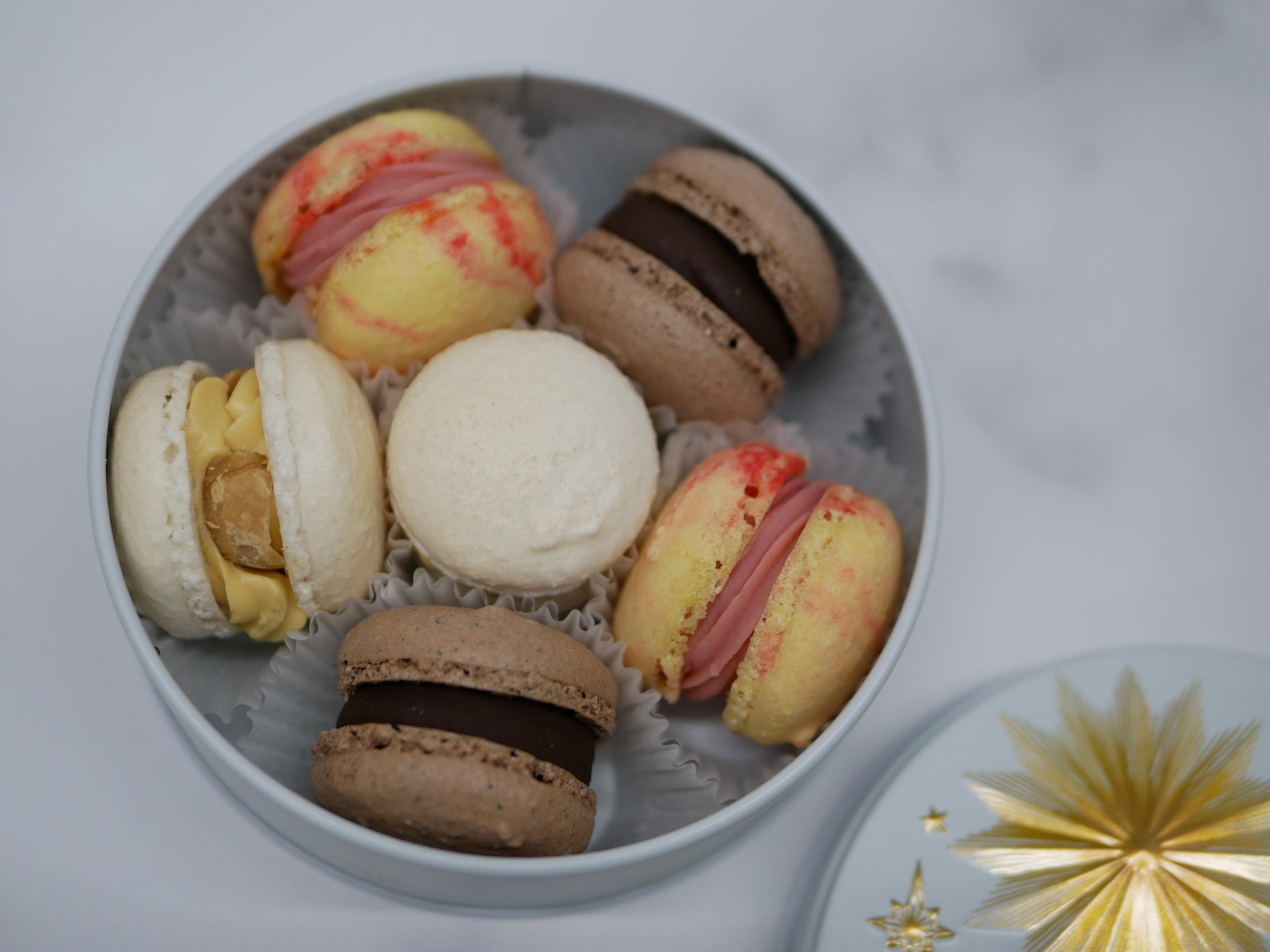 キャラメル風味のガナッシュとキャラメル風味のバタークリームとローストマカダミアナッツをサンドしました。キャラメルバタークリームは香り付けにほんの少しラム酒を加えております。