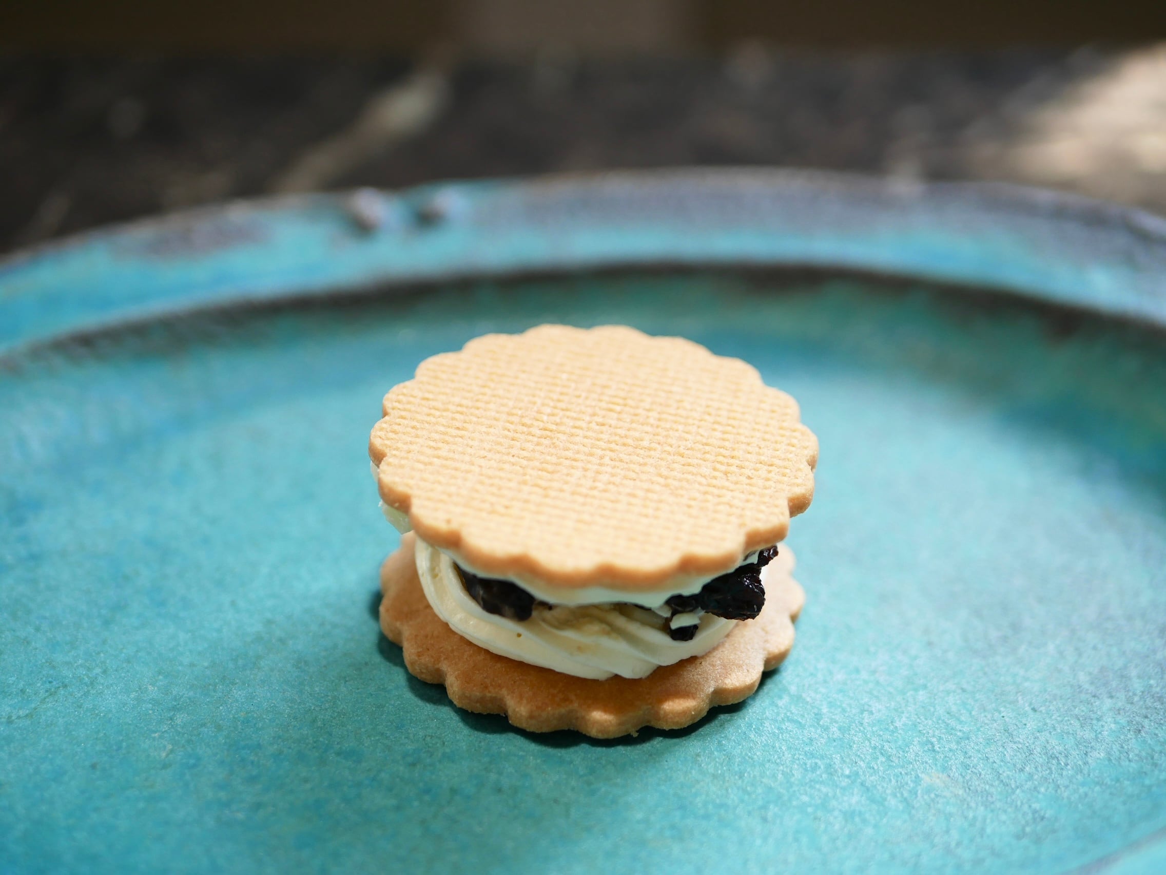 米粉で作ったサクサクのクッキーにジューシーなラムレーズンとラムバタークリーム、ホワイトチョコレートをサンドしました。