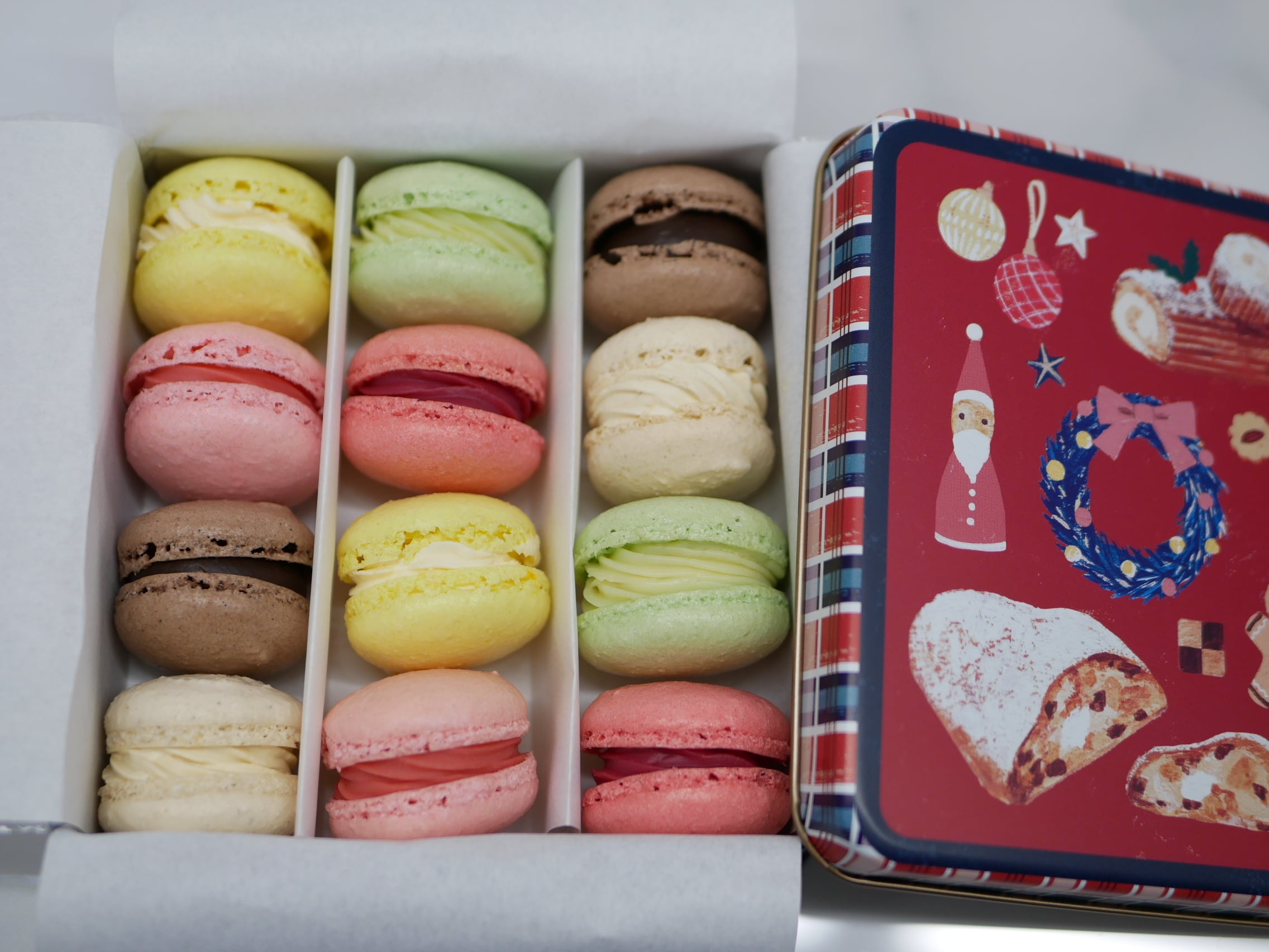 クリスマスの缶に入ったマカロンの詰め合わせになります。