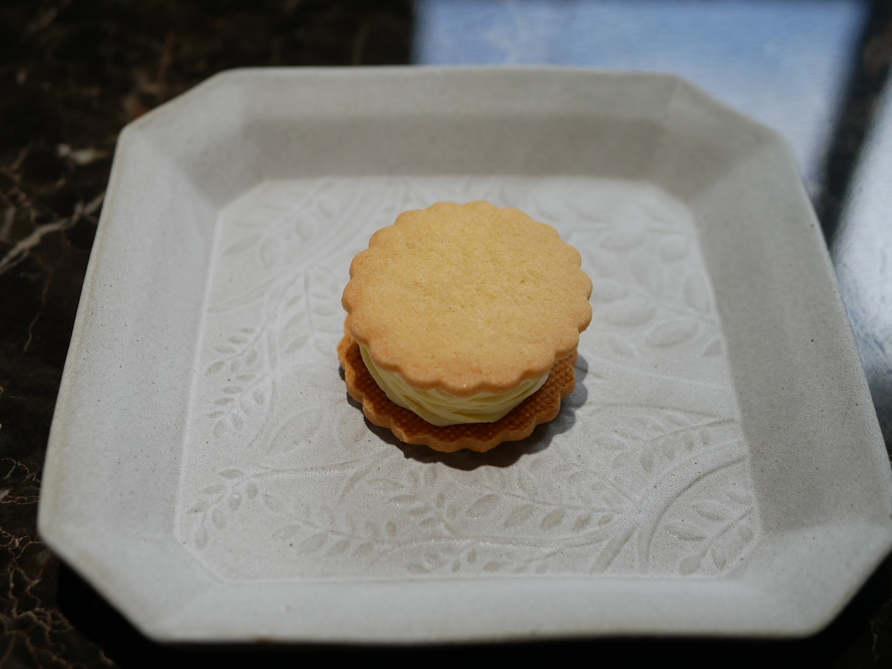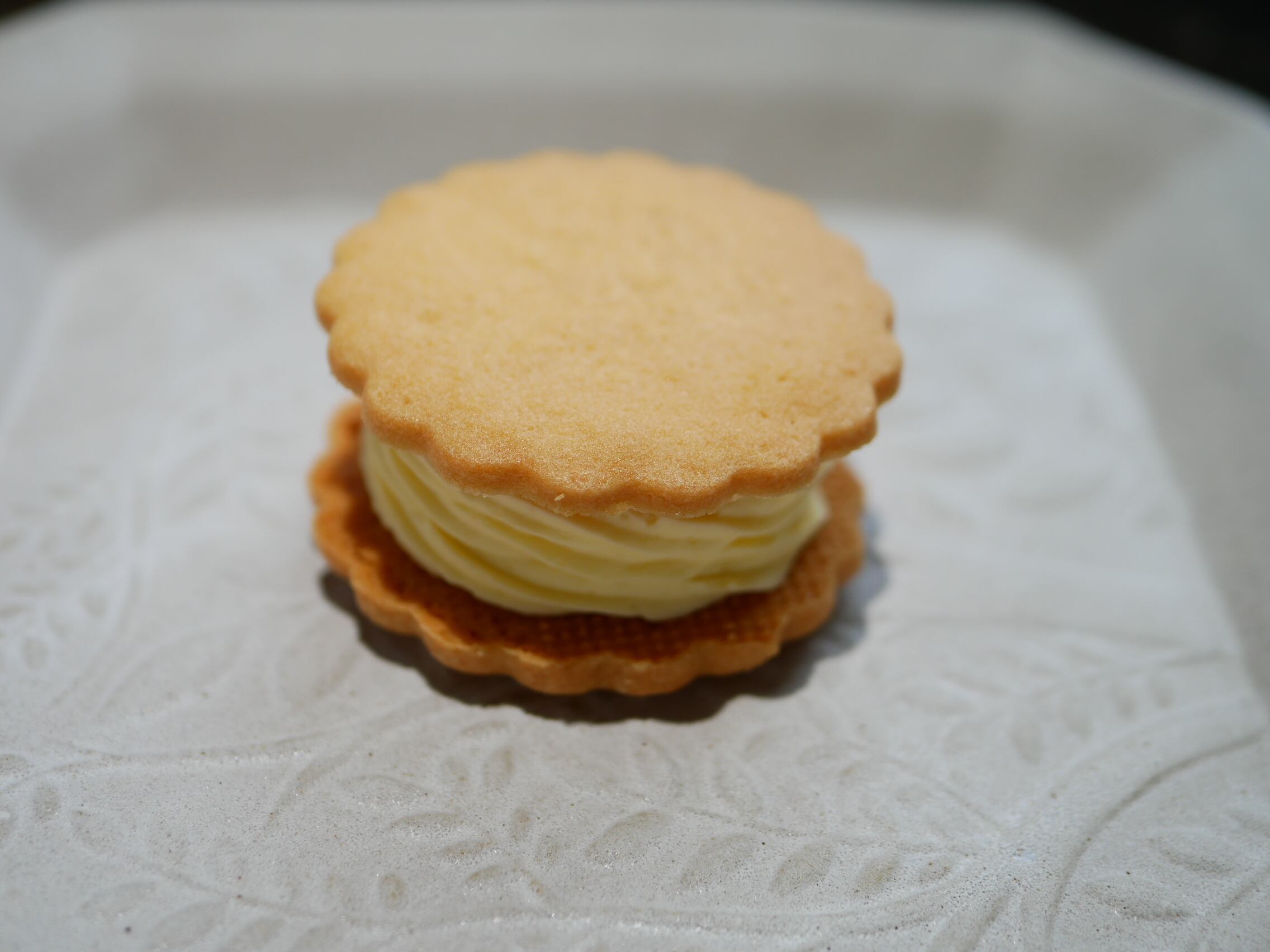 米粉で作ったサクサクのクッキーに塩気の効いたカマンベールバタークリームと中心にはちみつを入れてサンドしました。
