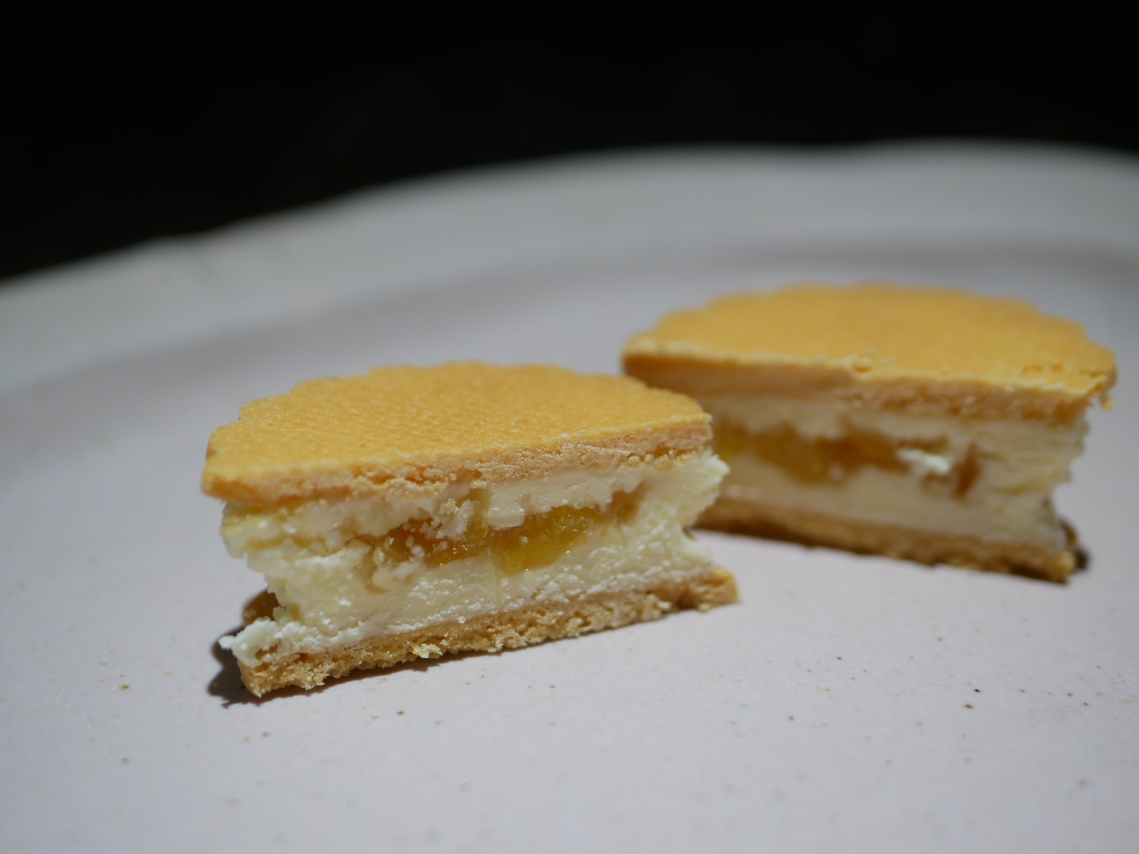 米粉で作ったサクサクのクッキーに九州産のクリーミーなチーズクリームと中心に酸味の効いたレモンのマーマレードを入れてサンドしました。